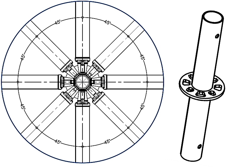 The SCAFFSHORE ring accurately aligns 45° to 90° connection between shoring standards. Up to 8 connections can be made all around the ring for enhance capacity of shoring, diagonal bracing or even cross bracing.