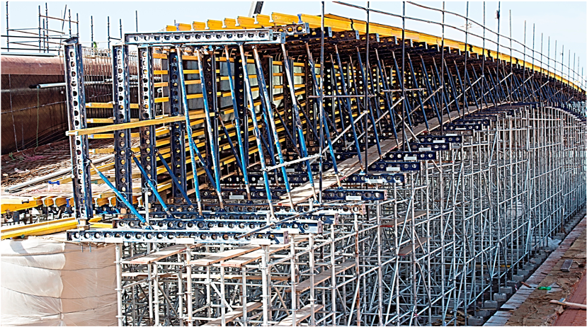 For typical load-bearing solution, the SCAFFSHORE 48 handles 40KN fresh concrete load using only 2 ledger level support. The capacity increases with the addition of more ledger supports.